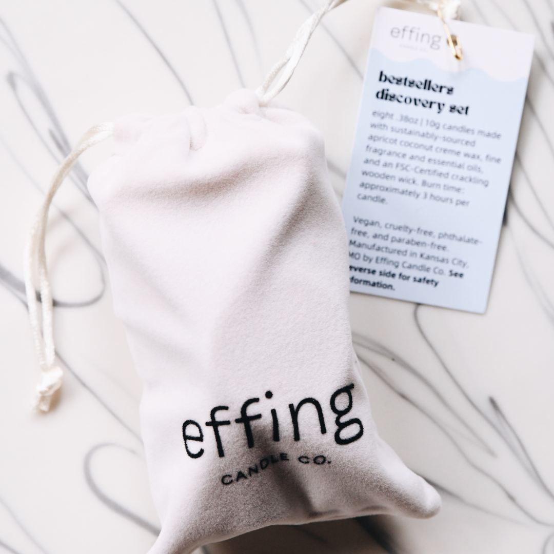Discover your new favorite candle scents with the Bestsellers Discovery Set! Featuring eight .38oz | 10g tealights in our bestselling scents. Discovery sets include complimentary economy shipping when you order on effingcandleco.com and hot pink Effing Candle Co. branded matches that are smooth and easy to light.