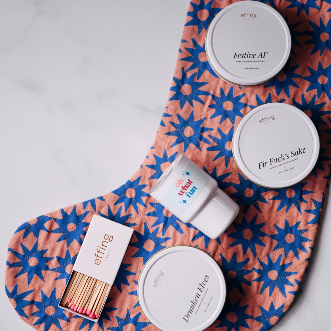 The Stocking Stuffer Jackpot Bundle is your holiday shortcut to looking like a gift-giving genius. Crack open this bundle and you've got everything you need: three travel candles to keep their space smelling like luxury, a mini tumbler candle in classic Gingerbread or Cranberry, and hot pink Effing Candle Co. matches that are almost too pretty to use.
